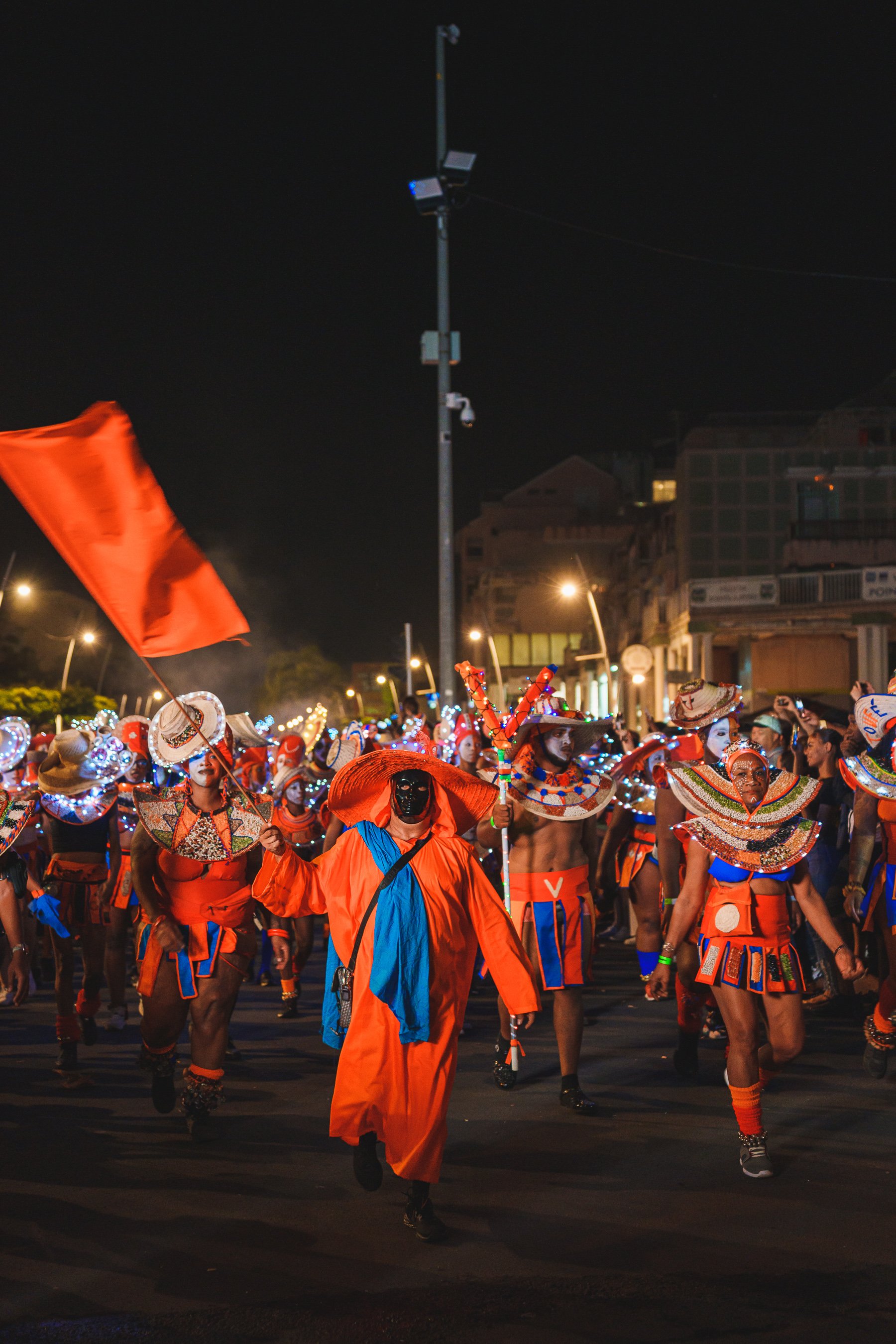 Cette photo, prise lors des défilés de Mardi Gras 2023, immortalise l'entrée du groupe VIM dans la rue Frébault à Pointe-à-Pitre. Elle fige l'instant où l'énergie et la puissance de la foule se déversent sur la rue, portées par les costumes vibrants et l'intensité du moment.